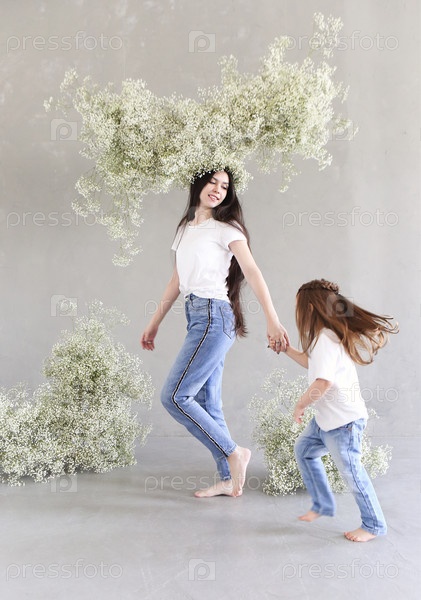 Молодая брюнетка мать и маленькая дочь стоят у стены с большим цветочным венком