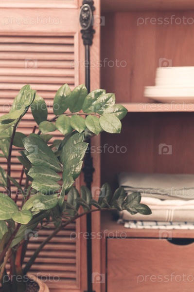 Кухонный шкаф с посудой, такой как тарелки, скатерти и стаканы