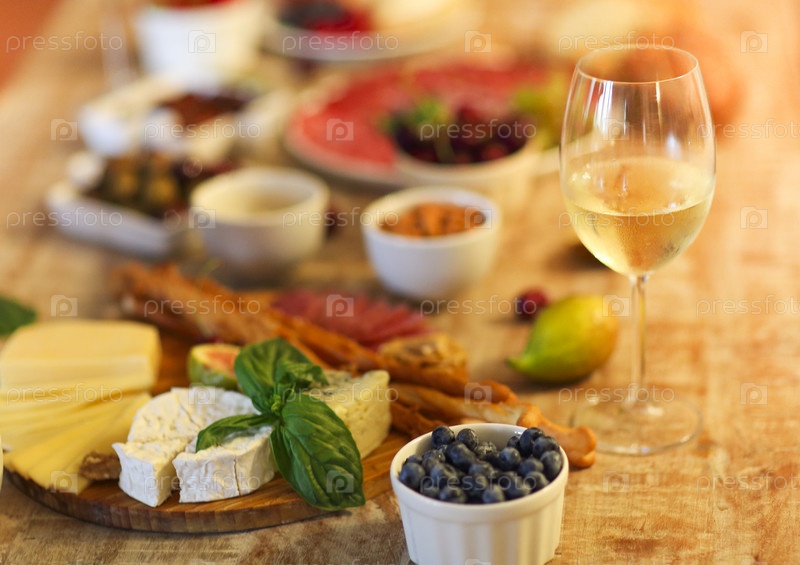 Ужин с закусками и бокалами на столе в гостиной