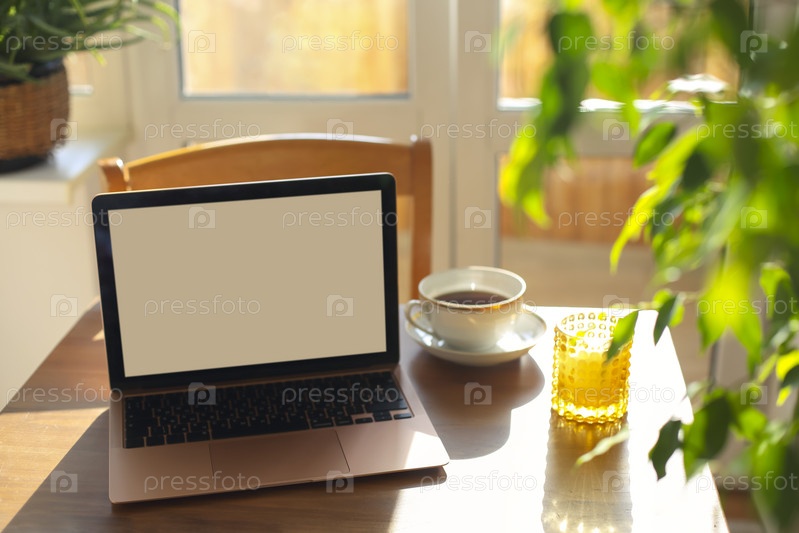 Уютное удаленное рабочее место с ноутбуком, чашкой чая и ароматной свечой дома, солнечный свет падает через окно