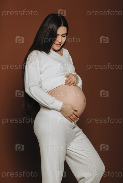 Молодая счастливая беременная женщина с длинными каштановыми волосами трогает живот и разговаривает с нерожденным ребенком