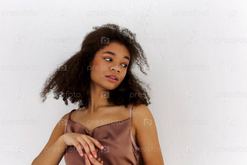 Молодая чувственная нежная кудрявая африканская американка в шелковом платье с ремешками на белом смотрит в сторону