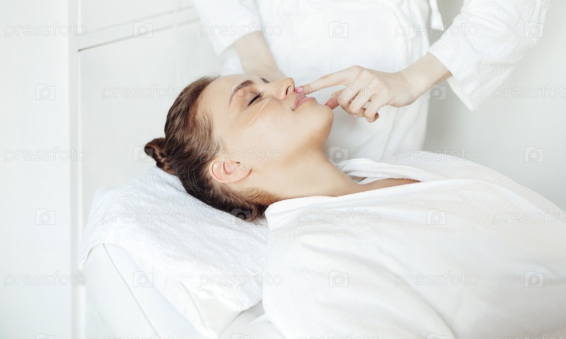 Косметолог накладывает повязки на лицо женщины
