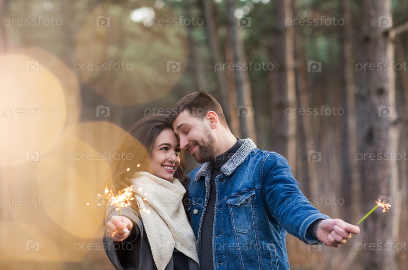 Счастливая пара обнимается и целуется в зимнем парке