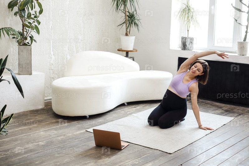 Счастливая брюнетка беременная женщина с ноутбуком занимается йогой дома