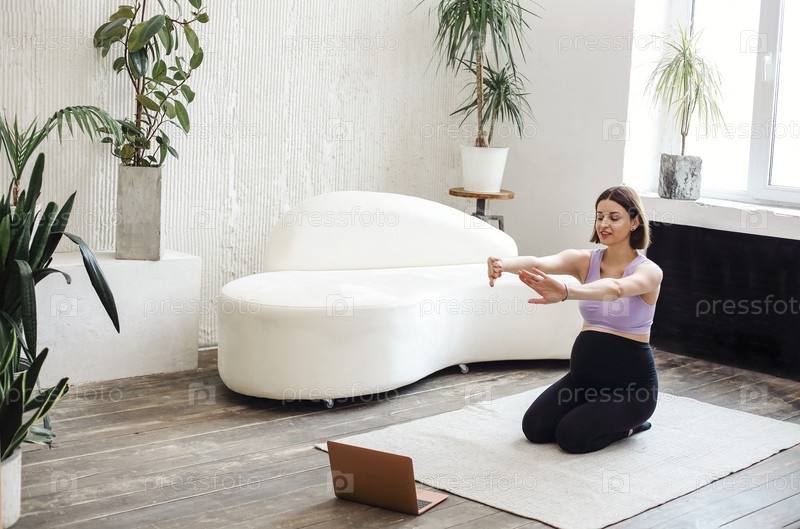 Счастливая брюнетка беременная женщина с ноутбуком занимается йогой дома