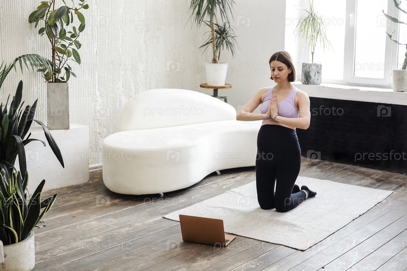 Счастливая брюнетка беременная женщина с ноутбуком занимается йогой дома