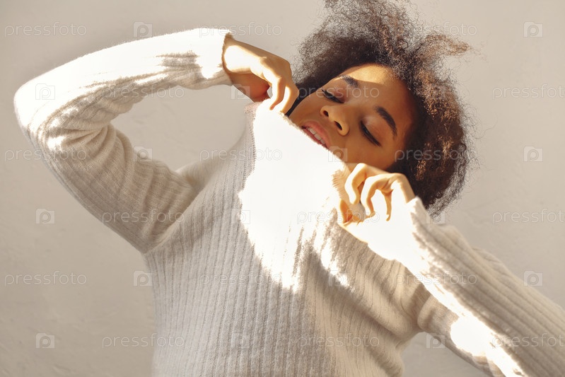 Молодая улыбающаяся черная девушка раздевается под солнечным светом, снимая теплый и мягкий белый вязаный свитер