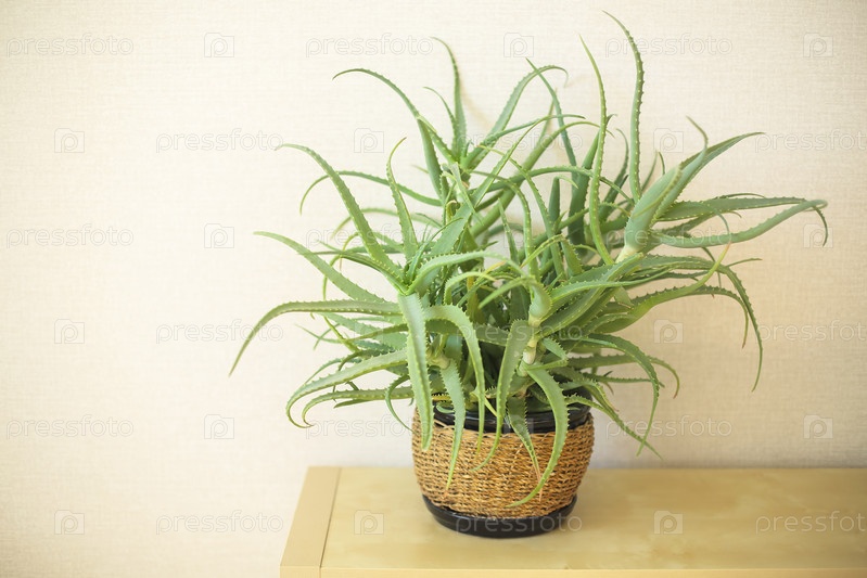 Комнатное растение алоэ в горшке на столе у бежевой стены. Уход за суккулентами и домашнее садоводство