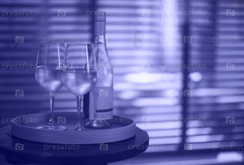 Два бокала белого вина и бутылка в ресторане на размытом фоне