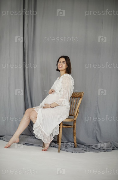 Привлекательная беременная женщина в белом платье сидит на деревянном стуле на синем фоне