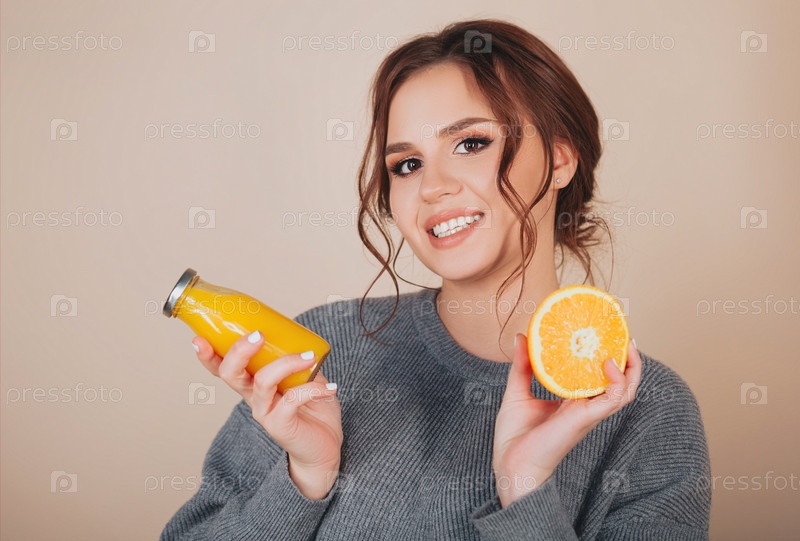 Брюнетка держит дольку апельсина и бутылку с апельсиновым соком