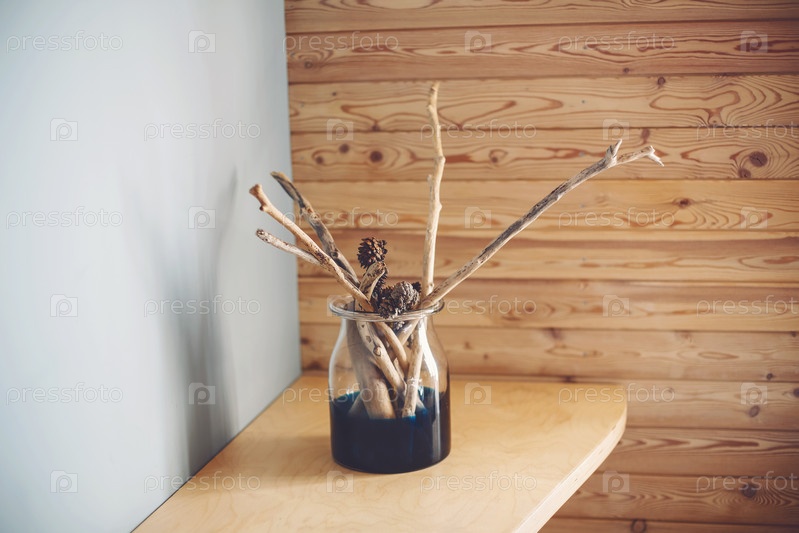 Ваза нейтрального цвета с деревянными палочками и натуральными шишками на проблемной деревянной полке на фоне грубой светло-серой синей стены