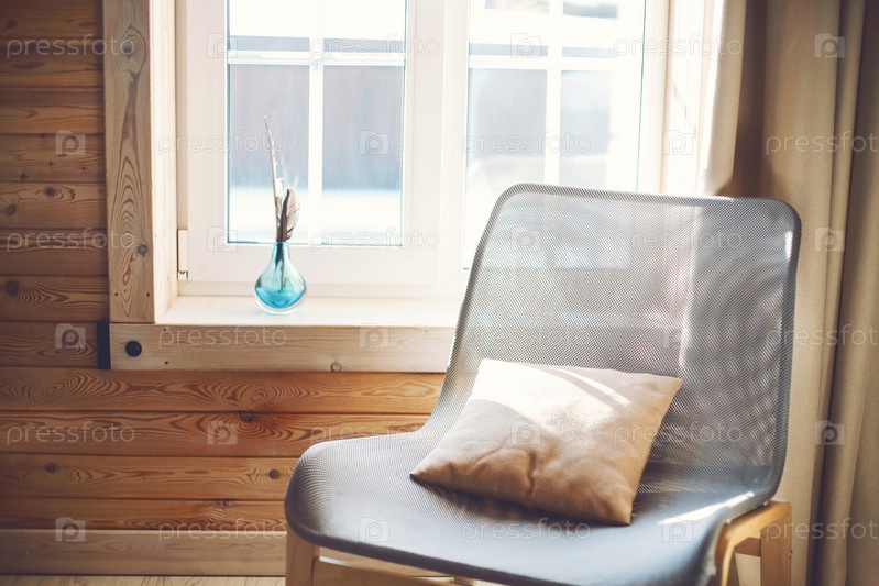 Интерьер уютного современного дома с этническим оформлением в стиле бохо. Кресло с подушкой на деревянном полу
