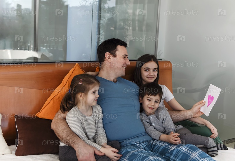 Счастливая семья сидит на кровати по утрам вместе во время празднования выходных счастливого дня отца