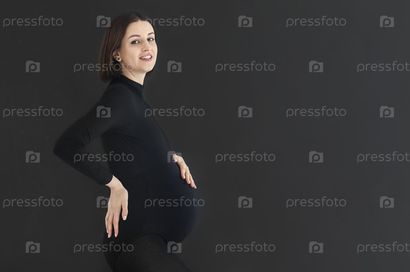 Беременная женщина стоит на черном фоне и смотрит в камеру, касаясь живота