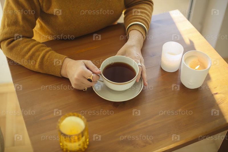 Женщина держит чашку горячего чая, сидя дома за столом с горящими свечами