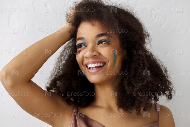 Счастливая афроамериканская молодая женщина с цветными мазками на лице. Креативный художественный макияж