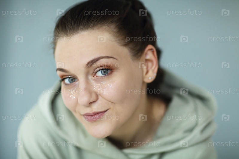 Красивый портрет молодой счастливой веселой женщины 30 лет, в повседневной толстовке, смотрящей прямо в камеру