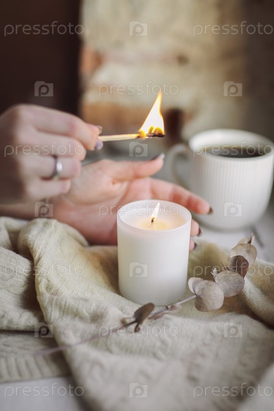 Обрезанное фото женских рук с зажженной спичечной свечой на подоконнике, образ жизни хюгге