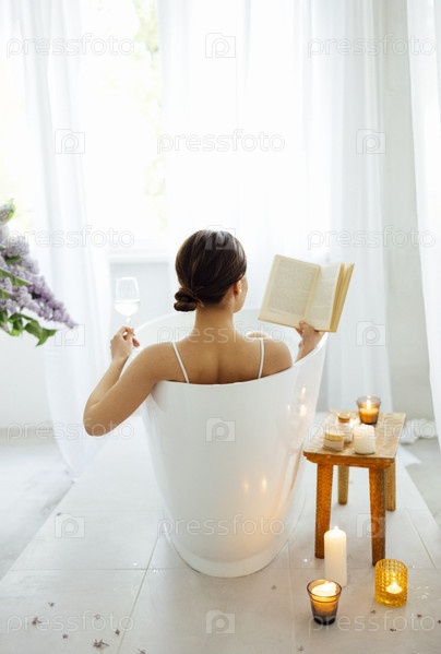 Вид сзади на молодую брюнетку, читающую книгу и пьющую белое вино в ванне с пеной и свечами