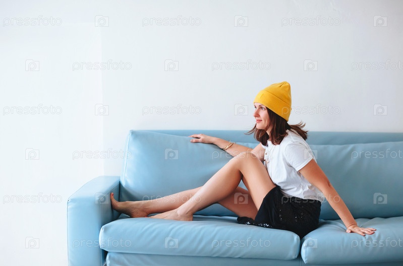 Стильная женщина сидит на диване