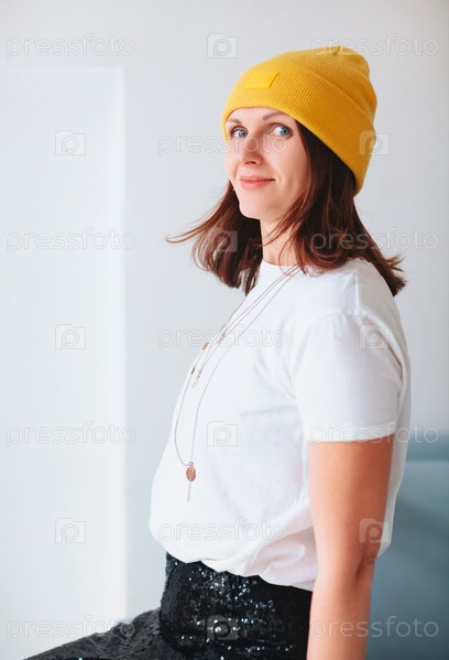 Стильная женщина сидит на диване
