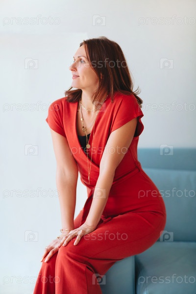 Счастливая женщина средних лет смотрит в сторону