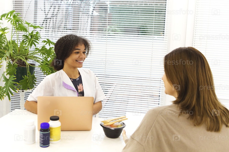 Улыбающаяся чернокожая женщина-врач беседует с пациенткой в клинике, советуя ей витамины