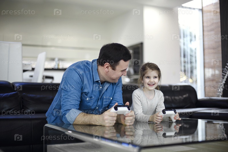 Улыбающийся молодой человек играет в видеоигры вместе с дочерью в современной гостиной