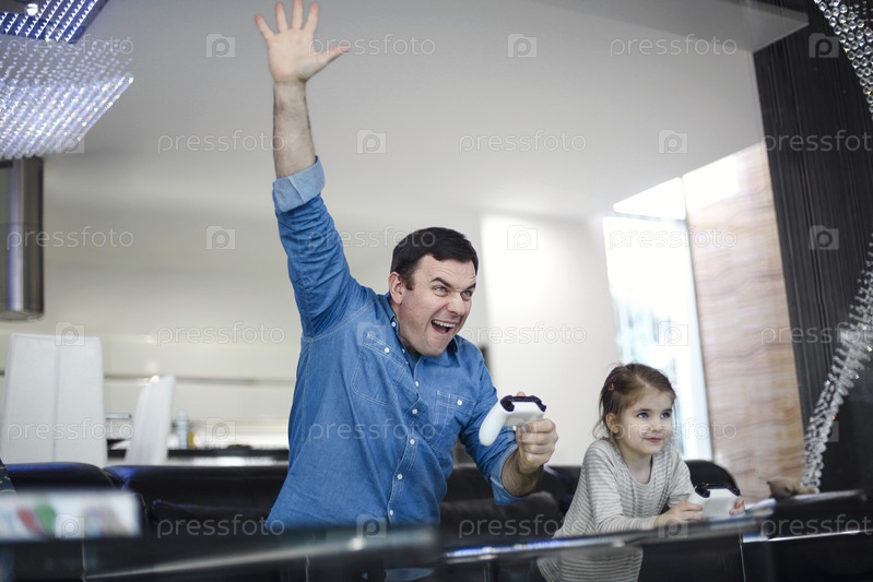 Улыбающийся молодой человек играет в видеоигры вместе с дочерью в современной гостиной