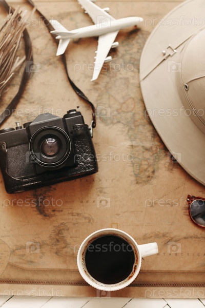 Вид сверху на винтажную карту мира с объектами, связанными с путешествием, экскурсиями и турами