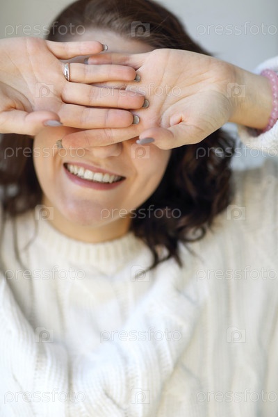 Счастливая восхищенная женщина в вязаном свитере закрывает глаза ладонями и улыбается в камеру