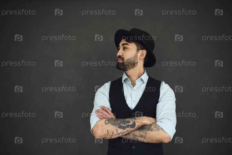 Студийный портрет красивого этнического мужчины со скрещенными татуированными руками, одетого в голубую рубашку