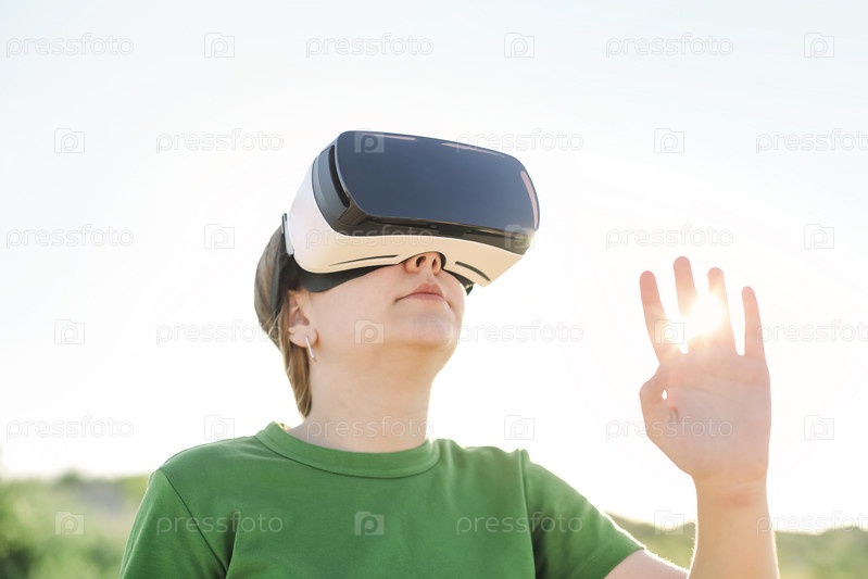 Молодая красивая стройная девочка-подросток в очках виртуальной реальности на открытом воздухе. Смартфон с гарнитурой очков виртуальной реальности