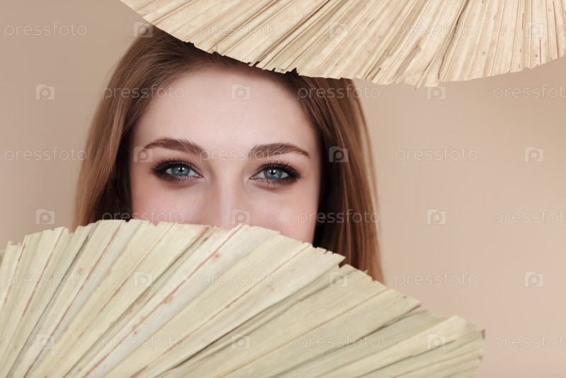 Молодая женщина закрыла лицо веером