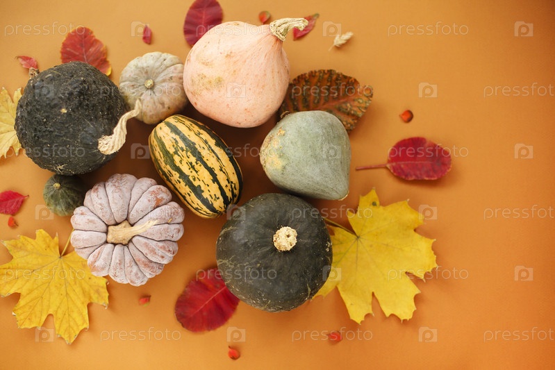 Композиция из тыквы и осенних листьев
