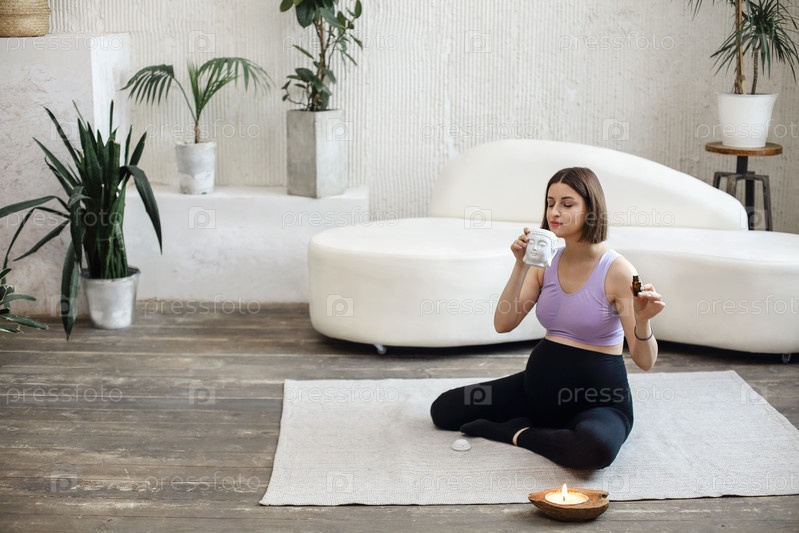 Беременная женщина держит бутылку эфирного масла и капает ее в аромалампу для ароматерапии и спокойной расслабляющей атмосферы, концентрации на медитации, процедурах ухода и других ритуалах