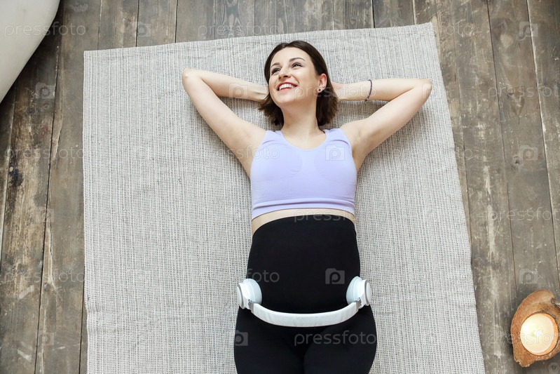 Беременная женщина использует наушники, чтобы играть классическую музыку для обучения и развития ребенка, чувствуя себя так расслабленно и комфортно