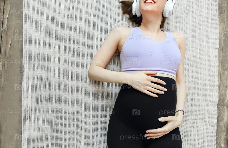 Изображение удивительно здоровой беременной женщины в помещении дома на ковре, слушающей музыку в наушниках
