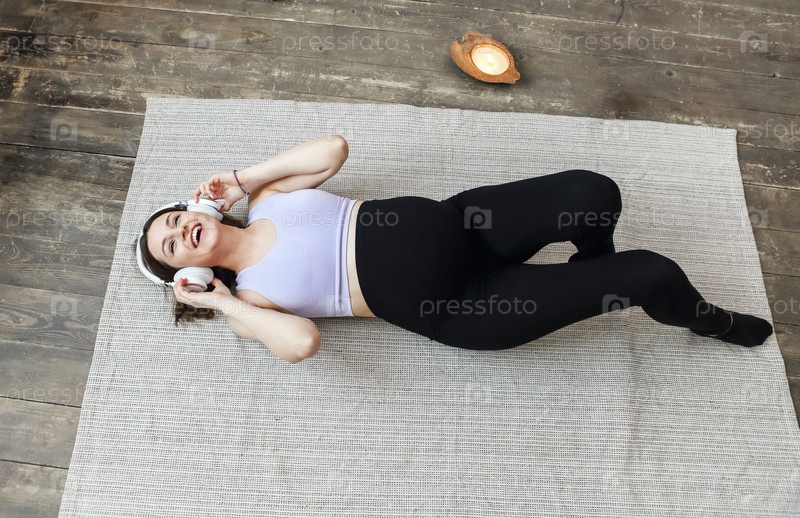 Изображение удивительно здоровой беременной женщины в помещении дома на полу на диване, слушающей музыку в наушниках