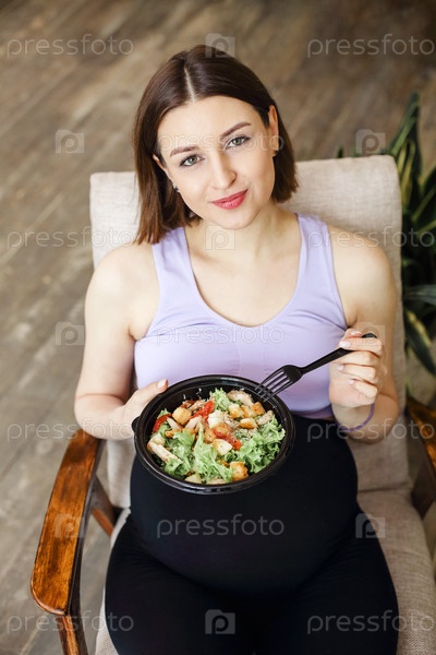 Беременная молодая брюнетка ест здоровый салат из миски сверху