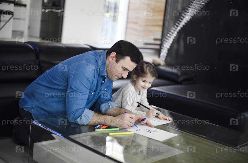 Молодой человек рисует вместе с маленькими дочерьми в гостиной
