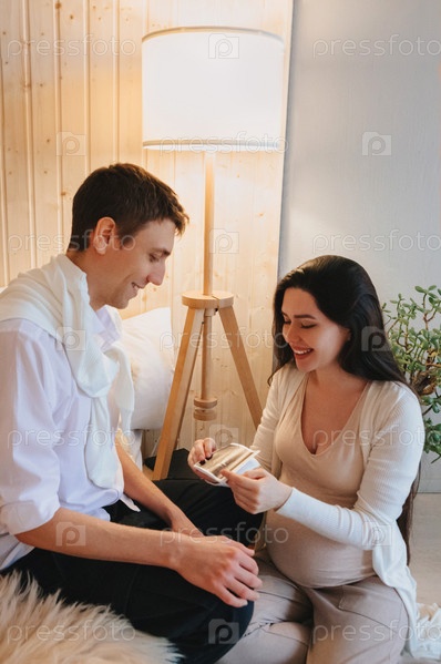 Молодая счастливая беременная женщина проводит УЗИ беременности, показывая изображение УЗИ приятно удивленному мужу, плачущему от счастья. Семейная пара ждет ребенка