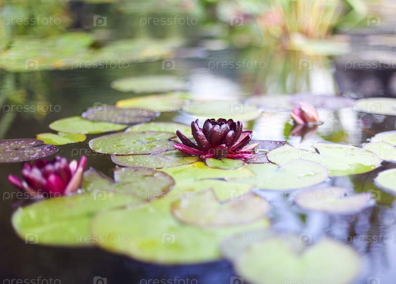 Красивая красная водяная лилия с зелеными листьями, плавающими в воде пруда в летнем саду