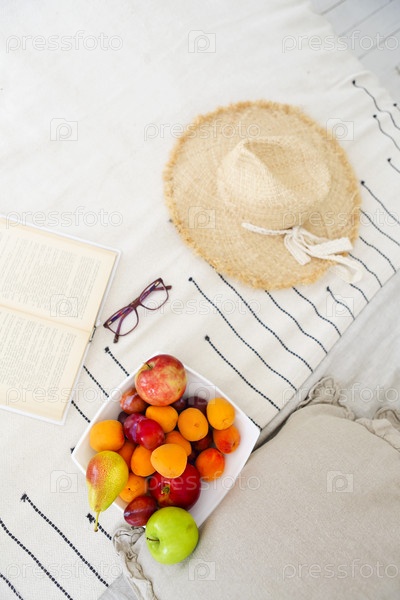 Тарелка с фруктовым ассортиментом и книга на кровати