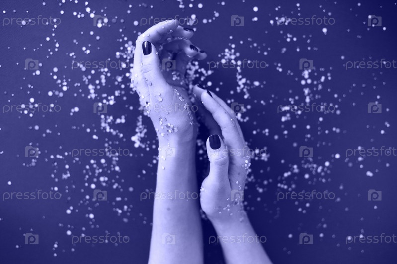 Урожайная женщина показывает маникюр на темно-синем фоне