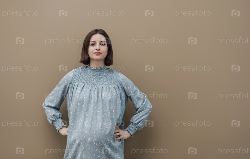 Привлекательная беременная женщина в голубом платье на бежевом фоне. Концепция материнства и здравоохранения