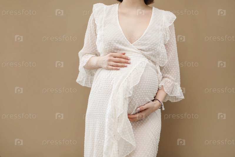 Привлекательная беременная женщина в белом платье на бежевом фоне