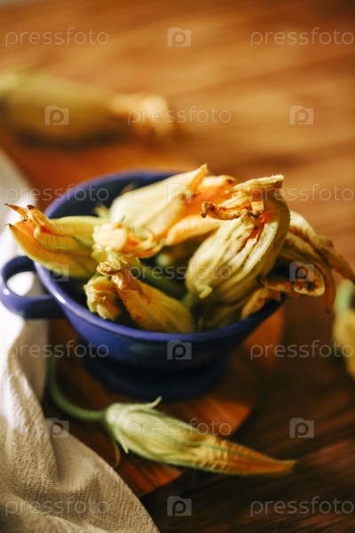 Свежие цветы цуккини крупным планом на кухне